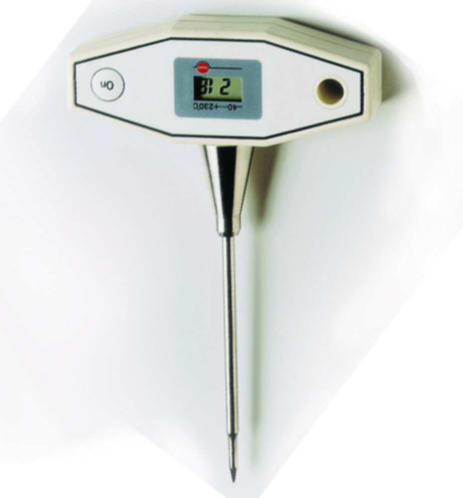 One-handed penetration thermometer. For measurements according to the EU Directive (EN13485) concerning the control of foodstuffs (HACCP). Waterproof, can be rinsed. With battery.