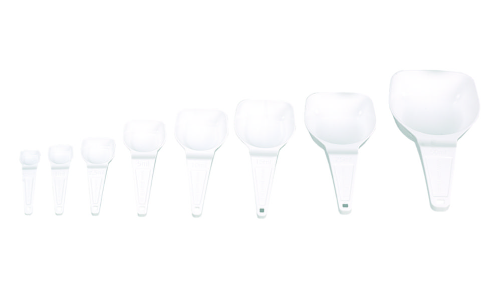 With the spoons, small quantities of powders, granulates and liquids can be precisely measured and dosed. Excess medium is wiped off at the top edge of the spoon for precise measurement. The volume is stamped on the handle.With wiping edgeCleanroom manufactured (cleanroom class 7)Food-safe
