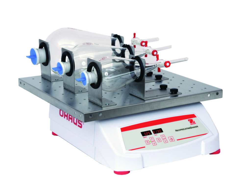 Holds 3 funnels at once on a 460 x 460 mm platform. Platform can accommodate 500 ml to 2 l separatory funnels. Includes platform, clamps and hardware to secure 3 funnels.