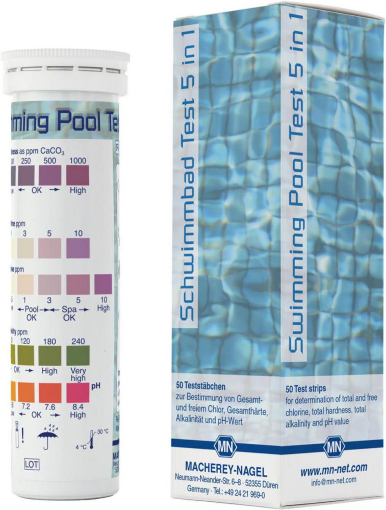 Test strip for semi-quantitative determination of free and total-chlorine, alkalinity, pH and total-hardness in pool water.