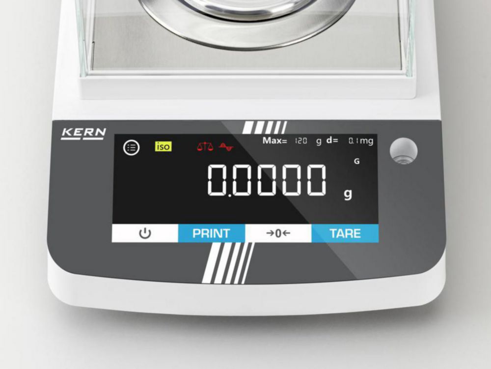 Analysenwaage mit vielseitigen Funktionen und Touch-Display für den Einsatz in der Pharmaindustrie und anderen Bereichen. Die Abfrage und Fernsteuerung der Waage erfolgt über Computer oder CRM-/ERP-Systeme mittels KERN Communication Protocol.