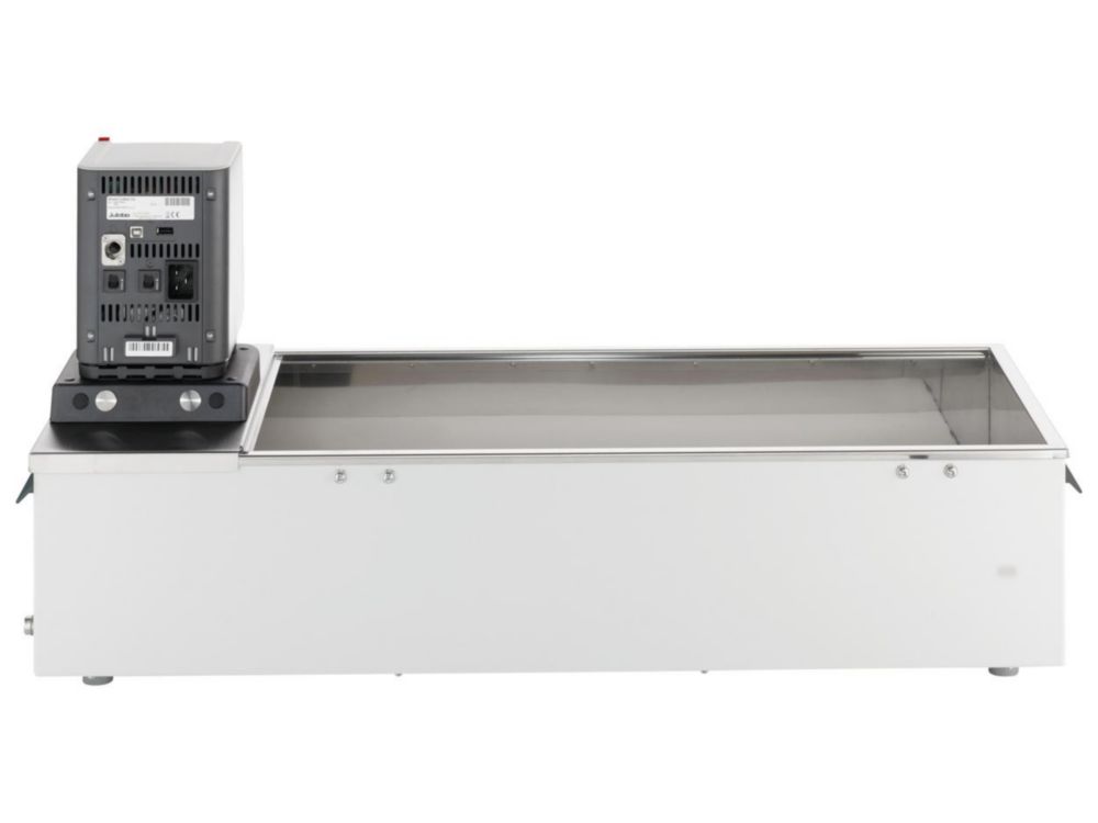 Bad-/Umwälzthermostat für interne und externe Temperieraufgaben mit Badgefäß aus Edelstahl und Pumpenanschlüssen.
