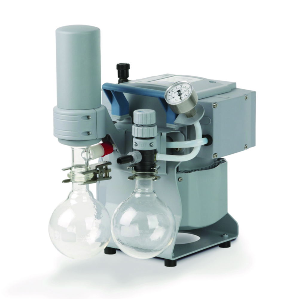 Zum Evakuieren, Eindampfen und Abpumpen von Gasen und Dämpfen in chemischen, biologischen und pharmazeutischen Laboren. Das manuelle Durchflussregelventil erlaubt das effektive Saugvermögen am Vakuumanschluss einzustellen und das Vakuum-Manometer liefert eine analoge Vakuumanzeige. Der druckseitige Emissionskondensator ermöglicht die nahezu hundertprozentige Rückgewinnung von Lösemitteln.