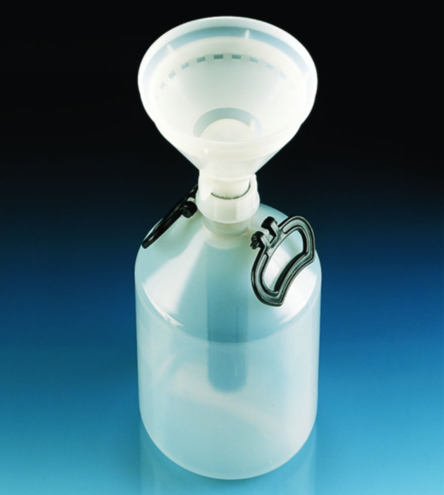 Zum Sammeln von flüssigen Chemikalien am Arbeitsplatz. Der Einfülltrichter (HDPE) enthält einen selbstschließenden Kugelschwimmer, eine Überfüllsicherung sowie einen Spritzschutz. Zusätzlich wird eine Verschraubung (GL 63) mit Dichtring mitgeliefert.