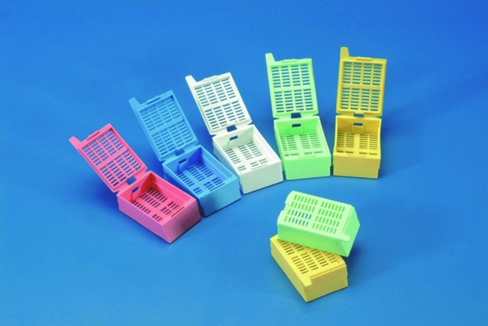 Kassetten für das Einbetten in Paraffin. Deckel mit Clipverschluss, der durch automatisches Brechen beim Verschließen der Kassetten leicht entfernt werden kann.