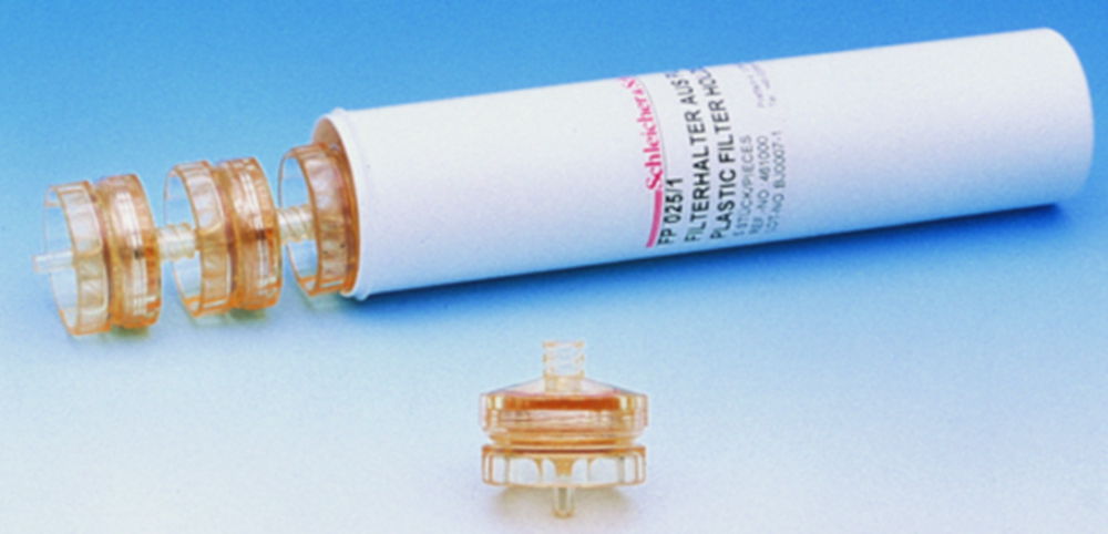 Druckfiltrationseinheit aus Polysulfon zur Probenaufbereitung für analytische und präparative Zwecke. Filtermedium nach Wahl einsetzbar. Mit Ansatz für Spritzen.