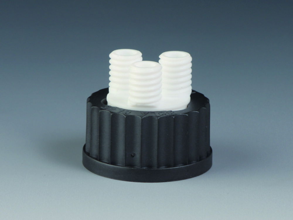Mit GL-Gewindehälsen und Schraubkappen. Passend für Flaschen mit Gewinde GL 45. Die Mehrfach-Verteiler sind ideal zum Umfüllen von Flüssigkeiten, wobei die Hälse entweder an eine Flüssigkeitsquelle oder an ein Über- bzw. Unterdrucksystem angeschlossen werden (bis Ø max. 8,5 mm). Für den problemlosen Leitungsanschluss empfehlen wir die BOLA-Laborverschraubungen, die Ihrem gewünschten Schlauch-Außen-Durchmesser entsprechend, separat geordert werden müssen.