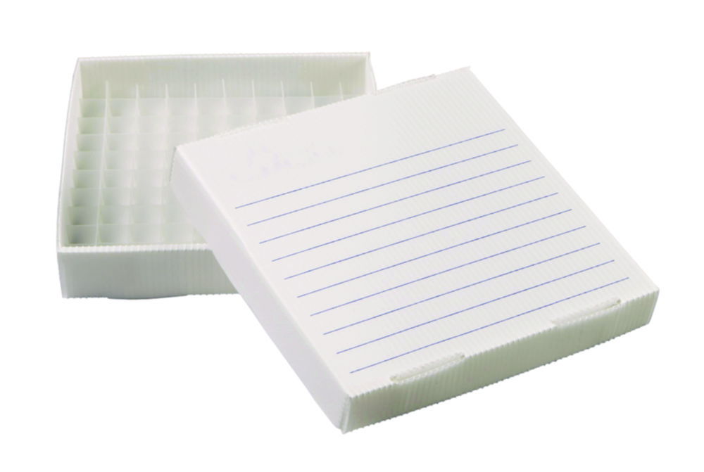 Wiederverwendbarer, kostengünstiger und feuchtigkeitsbeständiger Kunststoff. Diese einfach zusammensteckbaren Boxen werden in Einzelteilen geliefert um sicherzustellen, dass wertvoller Platz im Labor nicht vorzeitig belegt wird. Hergestellt aus gewelltem Polypropylen, welches langlebiger ist als Boxen aus Karton, da keine Anfälligkeit für Feuchtigkeit besteht. Wiederholtes Einfrieren und Auftauen der Boxen stellt kein Problem dar. Bereits zusammengesteckte Raster gehören zum Lieferumfang.