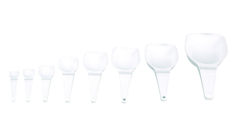 Mit den Löffeln lassen sich kleine Mengen Pulver, Granulate und Flüssigkeiten exakt abmessen und dosieren. Zum genauen Abmessen wird überschüssiges Medium an der Oberkante des Löffels abgestreift. Das Volumen ist am Griff eingeprägt. Durch den flachen Boden kann der Messlöffel abgelegt werden, ohne dass der Inhalt verschüttet wird.