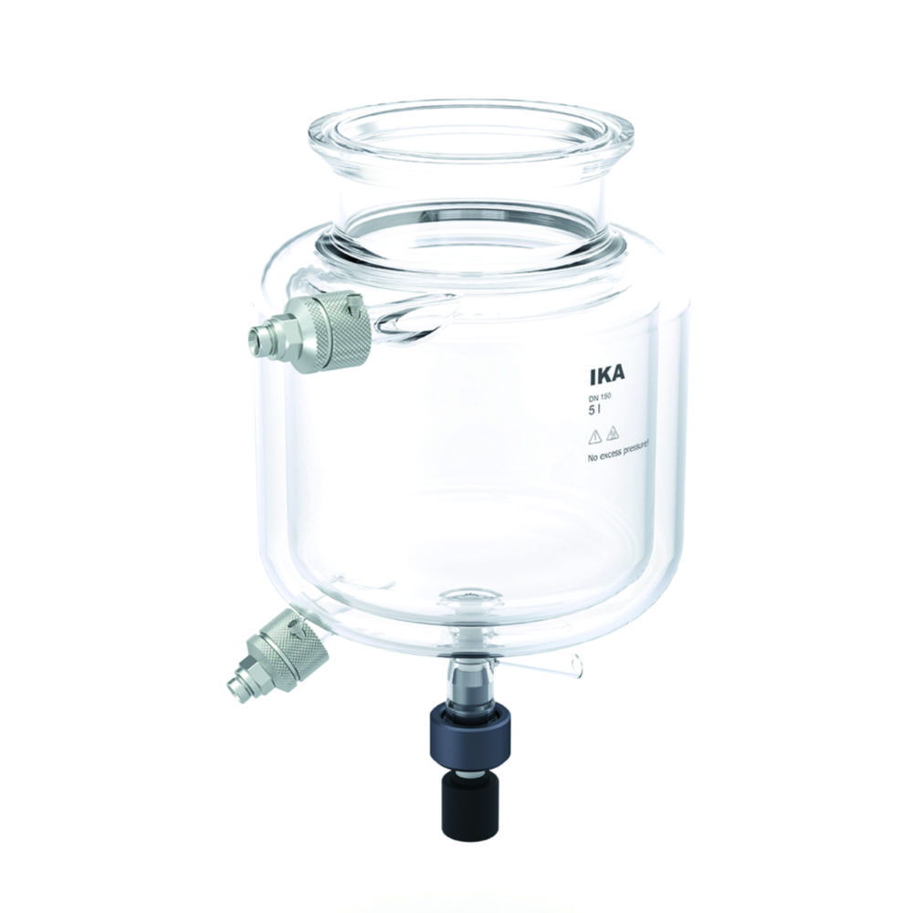 Doppelwandige Reaktorgefäße aus Borosilikatglas 3.3. Inkl. Edelstahl-Metalladapter M 16x1 (Male) zum Anbringen von Temperaturschläuchen.