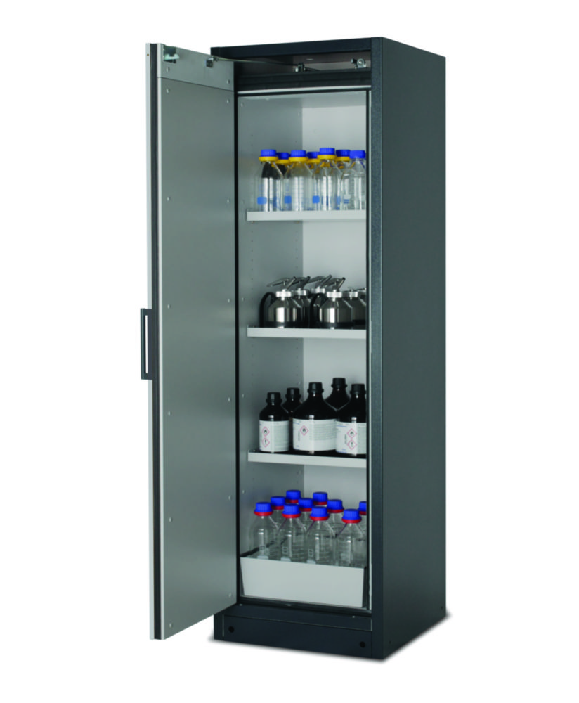 Lieferumfang: Sicherheitsschrank Modell Q90.195.120 oder Q90.195.060 inkl. Inneneinrichtung mit 3 Fachböden, Bodenauffangwanne mit Lochblecheinsatz als erste Stellebene