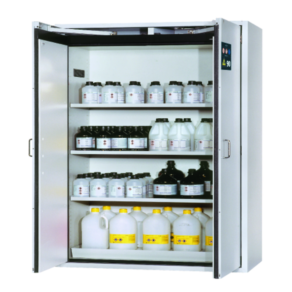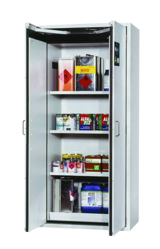 Lieferumfang: Sicherheitsschrank S-CLASSIC-90 Modell S90.196.120.WDAS oder S90.196.060.WDAS inkl. Inneneinrichtung mit 3 Fachböden, Bodenauffangwanne mit Lochblecheinsatz als erste Stellebene