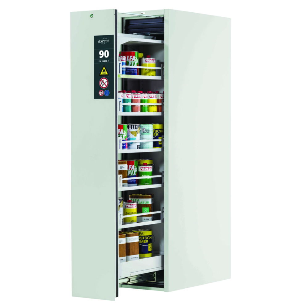 Die platzsparenden Sicherheitsschränke mit Vertikalauszug sorgen für optimale Übersicht und beidseitigen Zugriff auf alle eingelagerten Gebinde. Sichere und vorschriftsmäßige Lagerung entzündbarer Gefahrstoffe in Arbeitsräumen.