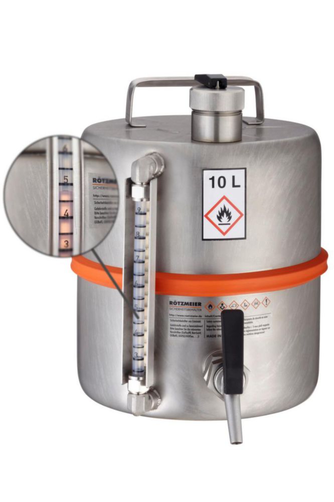 Für sichere Lagerung, Anwendung, Umfüllung und innerbetrieblichen Transport brennbarer Flüssigkeiten. Explosionsgeschützt durch Flammensicherungen und Überdruckventile in Schraubkappen und Feindosierern (selbstschließend). Aus hochwertigem und chemisch beständigem Edelstahl V4a/V2a, Dichtungen aus PTFE, ergonomische Tragegriffe.