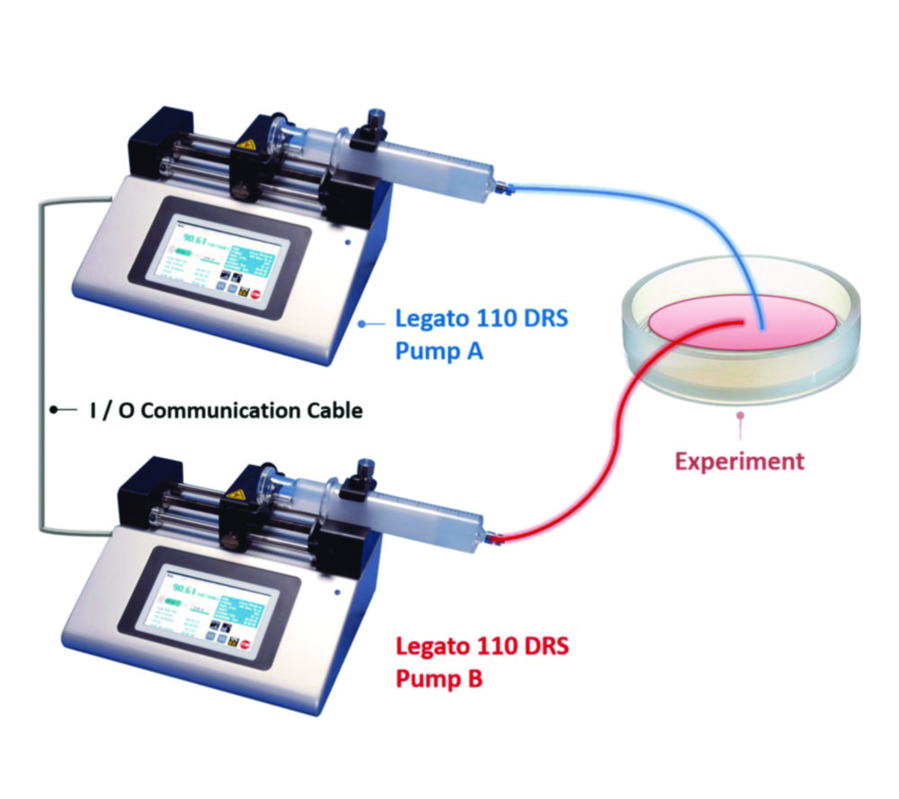 Duale Einspritzen-Pumpenkombination. Zwei Legato® 110-Pumpen, die mit einem Eingabe-/Ausgabekabel miteinander verbunden sind. Beide Pumpen können synchron gestartet und mit unterschiedlichen Flussraten betrieben werden. Geeignet sowohl für Zugabe wie auch Entnahme von Flüssigkeiten. Programmierbar für maximal zwei mehrstufige Programme zu je 50 Schritten. Diese Pumpe ist ideal für komplexe mehrstufige Dosierung und verfügt über einen Multi-Mode-Betrieb.