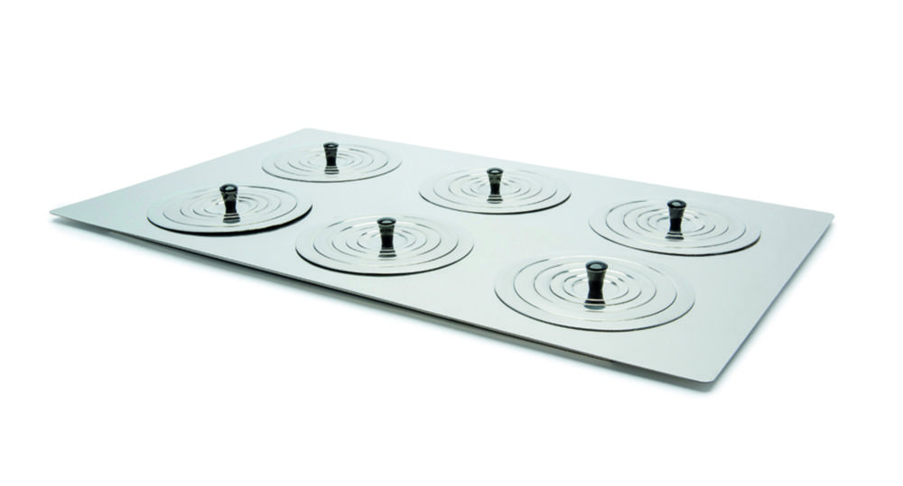 Flachdeckel für thermostatische Wasserbäder. Mit Ringsets von variablen Durchmesser zur Aufnahme großer Schiffe bei gleichzeitiger Reduzierung Verdunstung.