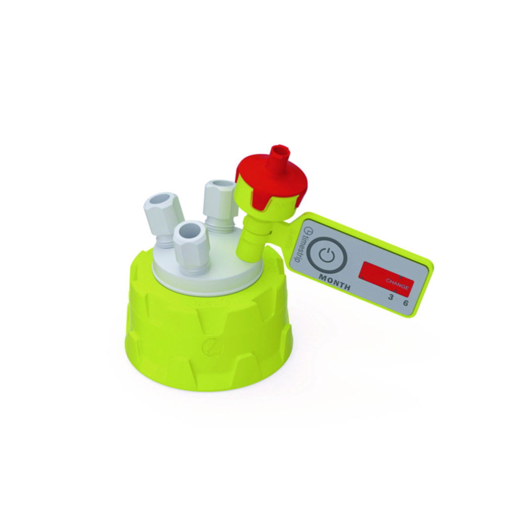 Schraubkappen, mit frei drehbarem Einsatz aus PTFE. Mit PFA-Fittings für Kapillaren mit Außendurchmesser 3,2 mm (Gewinde UNF 1/4"), PTFE-Fittings Präparativ für Schläuche mit Außendurchmesser 6,35 mm (Gewinde NPT 1/8") und einem Belüftungsventil mit Wechselanzeige.